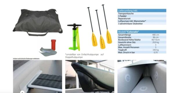 ALLROUNDMARIN COLORADO 480 cm je nafukovací kajak, ktorý spája extrémnu odolnosť s ľahkou prenosnosťou. Vďaka inovatívnemu materiálu Trop-Stitch – vystuženému PVC s padacím stehom, ako pri SUPoch – dosahuje kajak tuhosť pevných kanoe. Toto zaisťuje vynikajúce jazdné vlastnosti, stabilitu a optimálne klzné schopnosti. Smerovú stabilitu zvyšuje špeciálna podvodná konštrukcia a odnímateľná plutva.