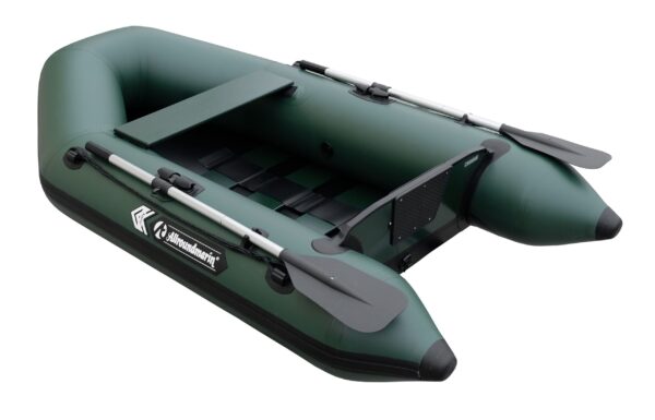 - Kompletná výbava: nožná pumpa, skladacie veslá s úchytmi, drevená lavička, vlečné kruhy, opravárenská sada.