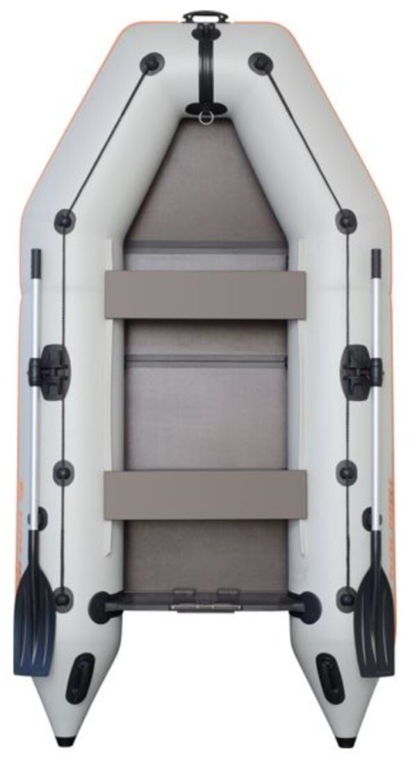 Konštrukcia člna zahŕňa pevnú skladaciu podlahu z vodeodolnej preglejky s protišmykovou úpravou, ktorá výrazne zvyšuje tuhosť a zlepšuje jazdné vlastnosti člna. Podlaha sa skladá z dielov, ktoré sú spojené do jedného celku pre jednoduchú manipuláciu. Po vybratí z člna je možné diely zložiť do kompaktných rozmerov, čo uľahčuje transport a skladovanie. Montáž a demontáž člna je rýchla a efektívna, zaberie maximálne 10-15 minút. Čln je vyrobený z vysokokvalitného 5-vrstvového PVC materiálu s hustotou 950g/m2, čo zaisťuje jeho dlhú životnosť a odolnosť. Vďaka pevnej podlahe získate v člne maximálnu stabilitu a pohodlie.