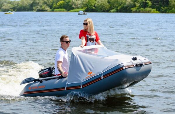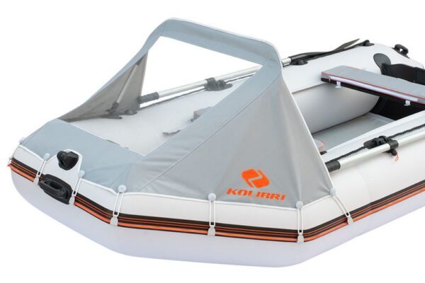 Vysoký sivý štít Dodger od KOLIBRI, určený pre motorové člny KM300DL, KM330DL a KM360DSL, výrazne zvýši váš komfort a bezpečie na vode.