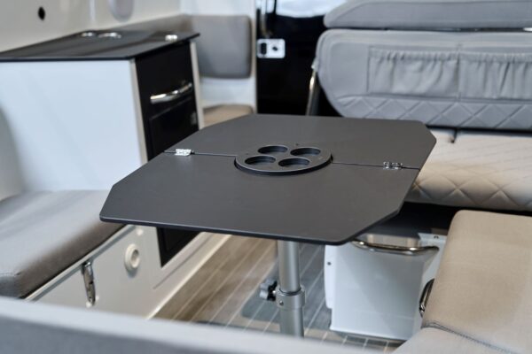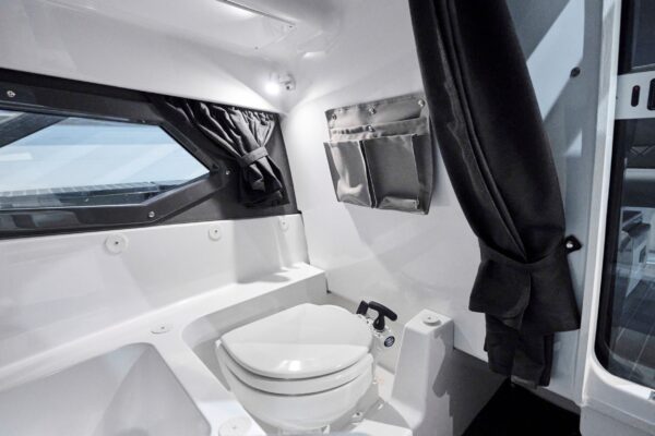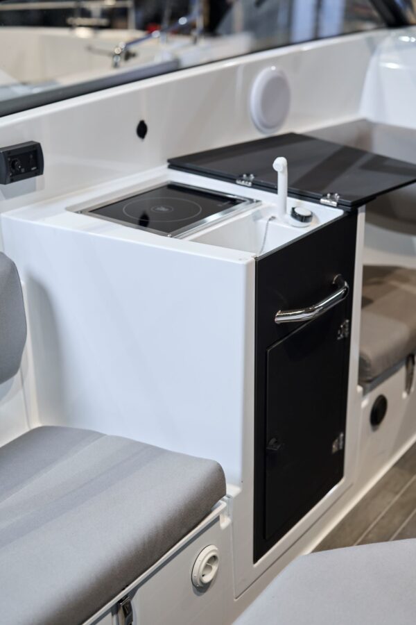 Svetlá kabína s posuvnými dverami a oknami je ideálna na oddych, prespanie a úložisko (voliteľná vodná toaleta). Otvorený priestor ponúka U-pohovku a otočné sedadlo vodiča pre sedem osôb, s voliteľným stolíkom a soláriom. Prémiová edícia pridáva chladničku, sporák a tlakový vodný systém. Miesto vodiča je ergonomické s 10-palcovým Yamarin Q displejom. Bezpečný pohyb zaisťujú rovné paluby, schodíky a plavecké plošiny; Premium balík zahŕňa aj oblúk na vodné lyžovanie.