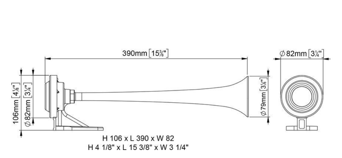 napätie - 24 V, spotreba - 9 A, frekvencia - 326 Hz, hlasitosť - 114 dB, dĺžka - 390 mm, priemer trúby - 80 mm.