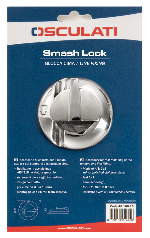 Inovatívne príslušenstvo paluby pre rýchle upevnenie fendrov a upevnenie lana. Vyrobené zo zrkadlovo leštenej nehrdzavejúcej ocele AISI316, kompaktný dizajn a okamžitý uzamykací systém. Určené pre laná priemeru Ø 6 až 10 mm. Montáž pomocou skrutiek M5 so zápustnou hlavou.