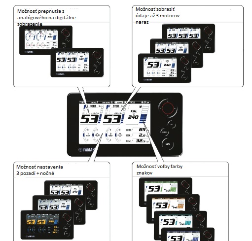Vďaka veľkému multifunkčnému celofarebnému 5" LCD displeju s vysokým rozlíšením sa systém 6Y9 Premium Digital Network Gauge II nakonfiguruje tak, aby ucelene a prehľadne zobrazoval niekoľko rôznych kombinácií podľa Vašich preferencií, a to ako pre prívesný motor, tak i pre samotnú loď.
