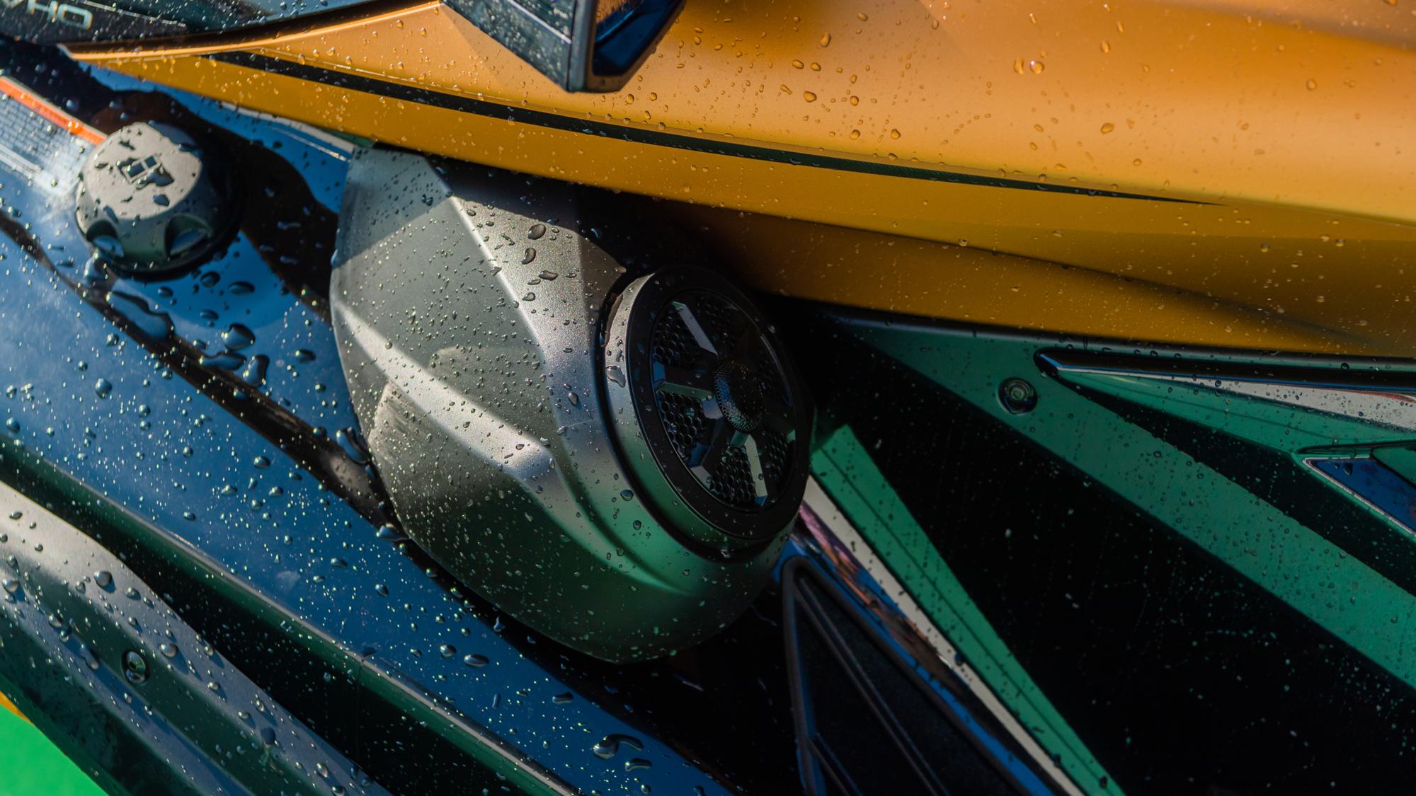 Vychutnajte si vynikajúci zvuk reproduktorov. Ich dizajn navyše dokonale ladí s líniami modelu WaveRunner. Reproduktory sú dokonale umiestnené v priestore na nohy a ovládajú sa z ľahko prístupného panela vedľa riadidiel. Na ochranu akumulátora sme stroj vybavili nízkonapäťovým regulátorom.